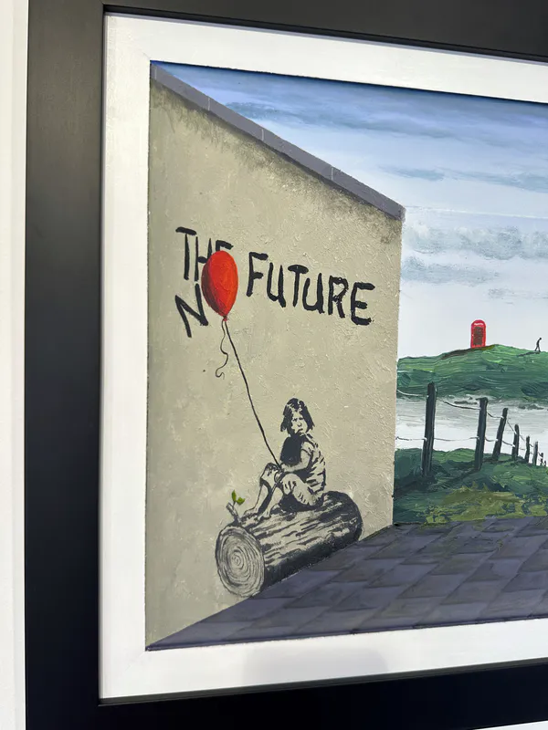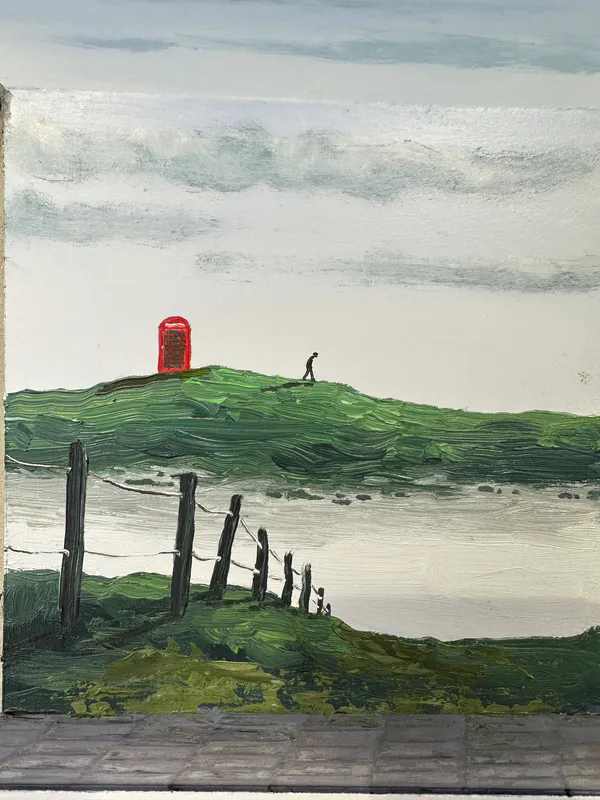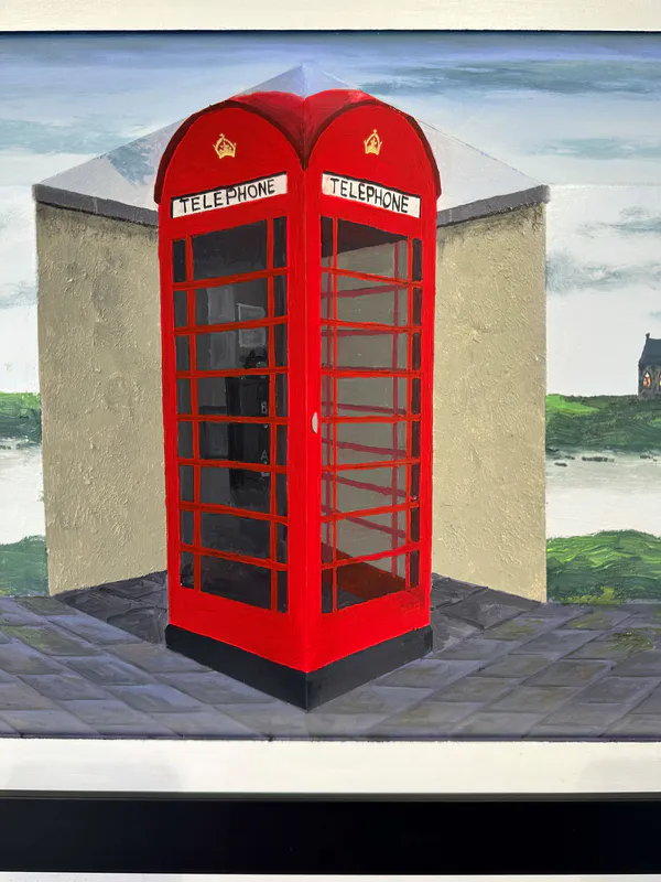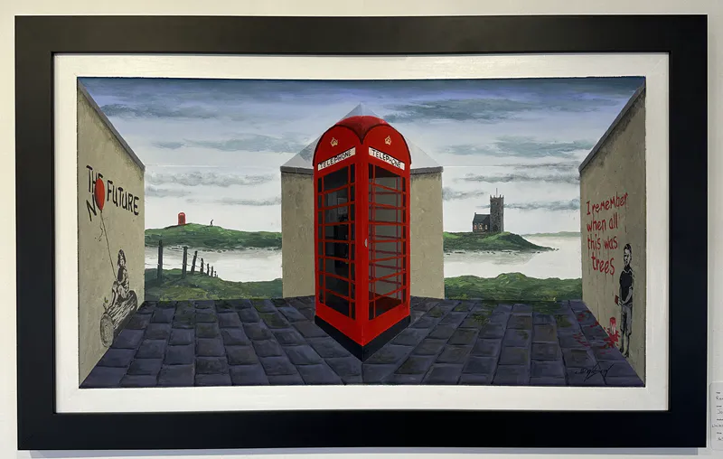 The old English phone box is the heart of this painting and it rotates when you walk past it - tricking the eye that the painting is moving.