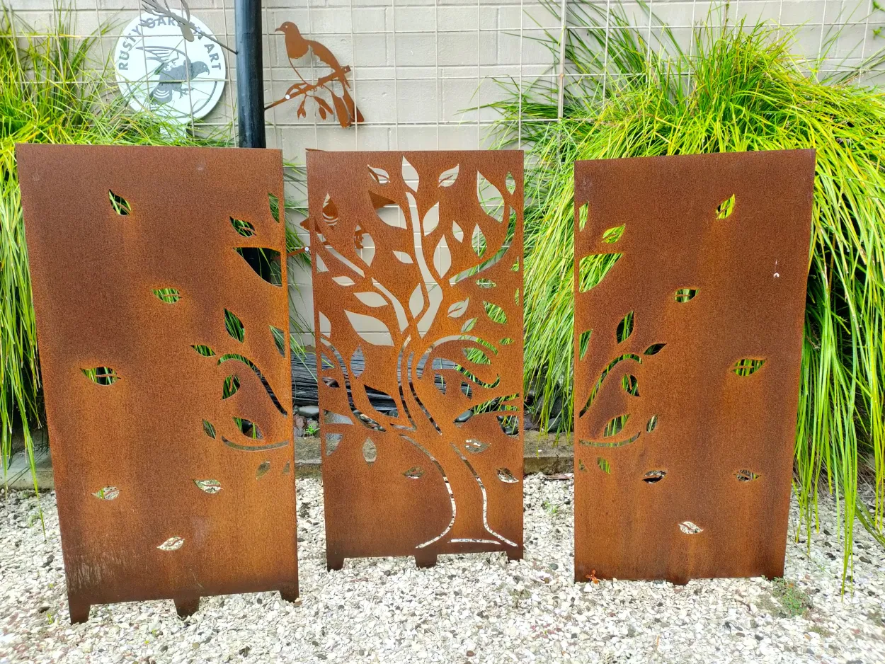 Heather’ s garden sculptures depict a bold and solid statement. They are cut from corten steel, which, when weathers turn a rich ochre color.