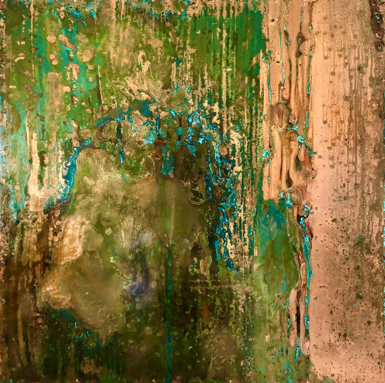 My artwork is a very whole process where I complete all the involved labour myself from building the framed substrate to carrying my ideas from mind to hand. I have deliberately taken new shiny copper and processed it to produce a finish that resembles old forgotten metals often found in derelict Industrial settings yet hints delicately at masters like Klimt from the moody Art Deco/Nouveaux era. My copper art has been sealed so will remain unchanging for years to come.