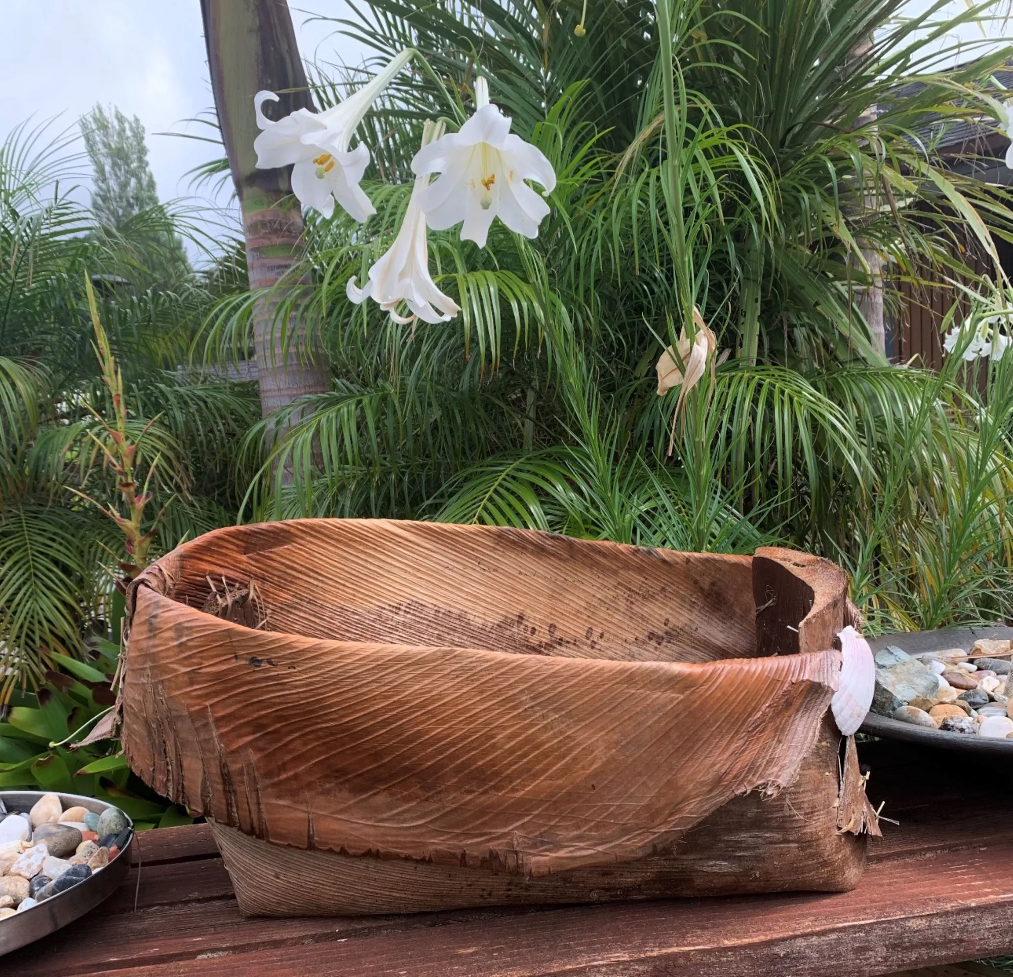 With a keen eye for possibility, she gathers treasures from her coastal surroundings—fallen fronds, shells, and found objects—and gives them new life through her craft. Each piece she creates carries the essence of Whangamatā: natural, unpretentious, and full of character.