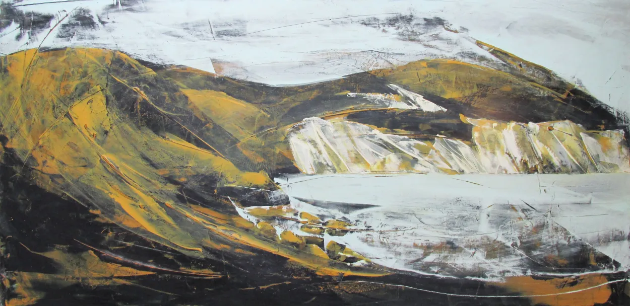 Mainly, I work with acrylics in either buttery thick or thin-multiple glaze layers. Most of my paintings are applied with an acrylic version of encaustic technique with multiple layers of acrylic paint with an acrylic wax slathered on between the layers. The wax allows light and movement into the painting. My bases can be timber, board, canvas and very heavy art paper. I often describe my painting style as ‘abstractly moving the paint around’ with silicon & steel spreading tools that sometimes look like they would be from a kitchen or a construction hardware shelf.