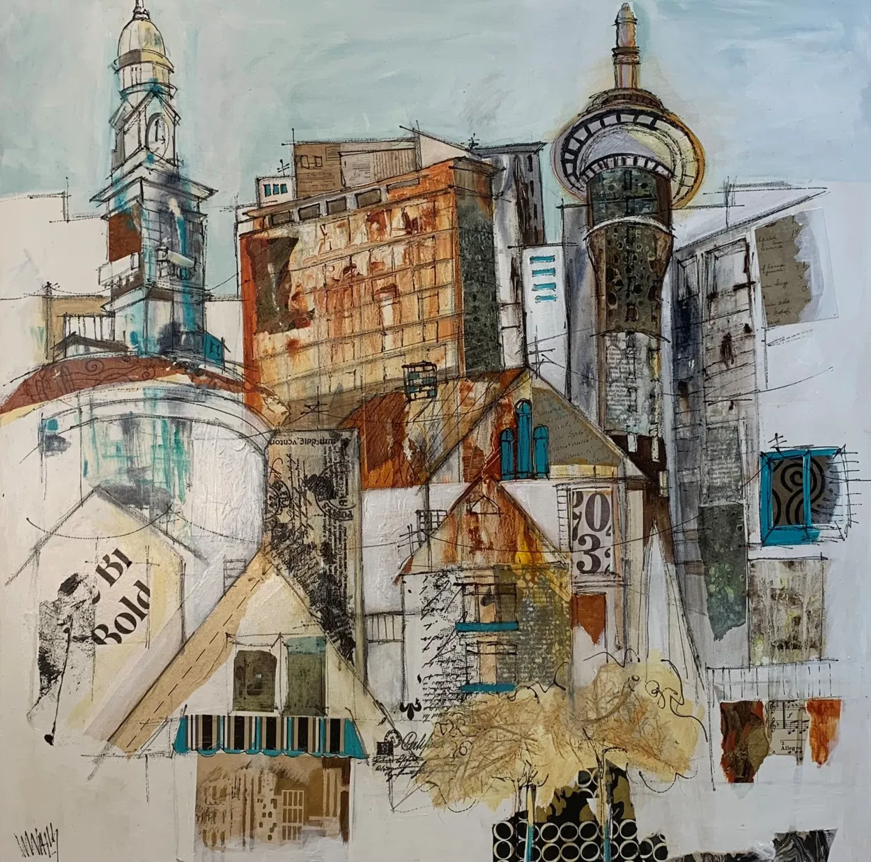 Wendy combines a wide range of art materials in her mixed media paintings, including gels, pastes, fluid acrylics, inks, skins, collage, and heavy body paints.