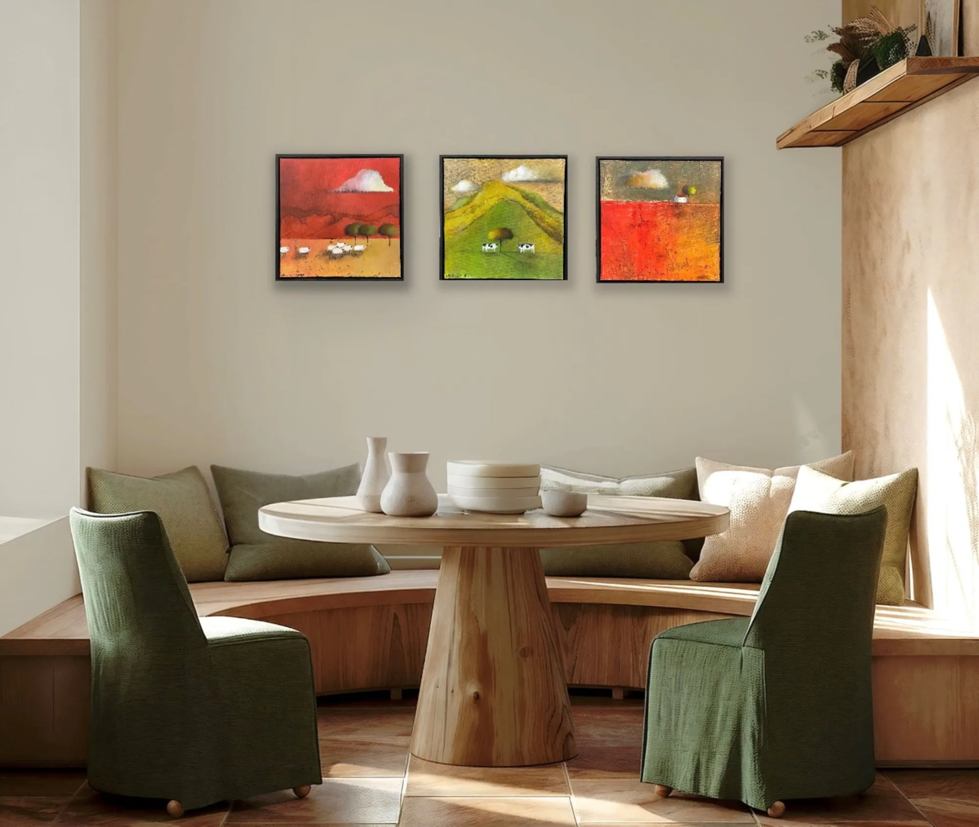 An original painting of a landscape in burnt reds with sheep by Dalene Meirings, available at The Little Gallery Tairua