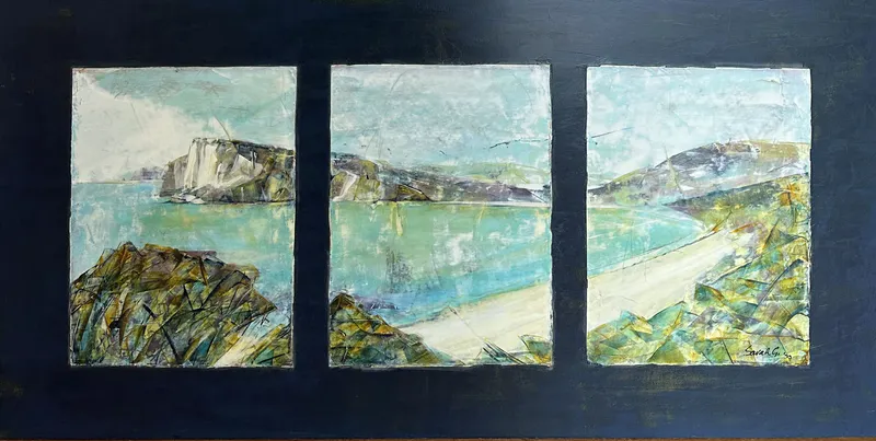 Created with a pallet knife using acrylic paint and layers of wax on paper and then on board, with background painted navy giving the illusion that it has a matt around it.
