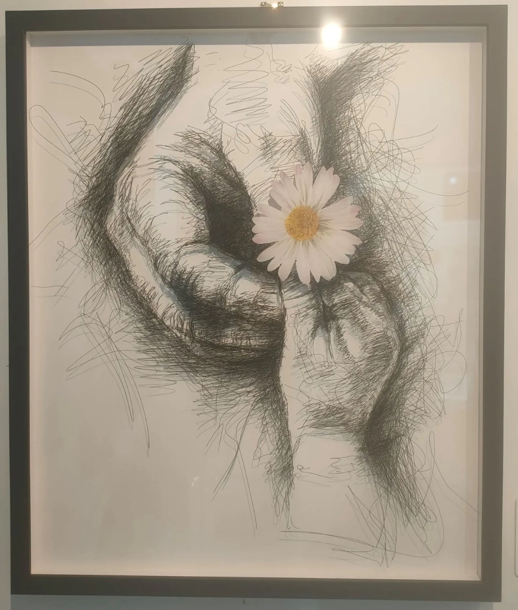 A screenprint of the original sketch which has been reverse printed onto the back of the perspex. The daisy has been reverse painted on the back of the perspex and the artwork has been framed with a gap between the perspex and backing board so a shadow reflects giving a three dimensional look.