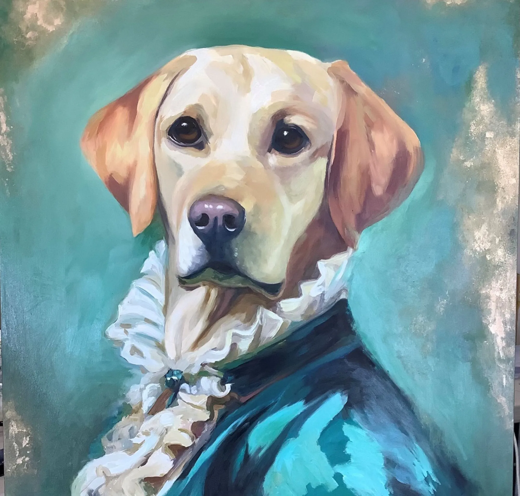 An original contemporary painting with a dog dressed in human clothes by Anita Gate, available at The Little Gallery Tairua
