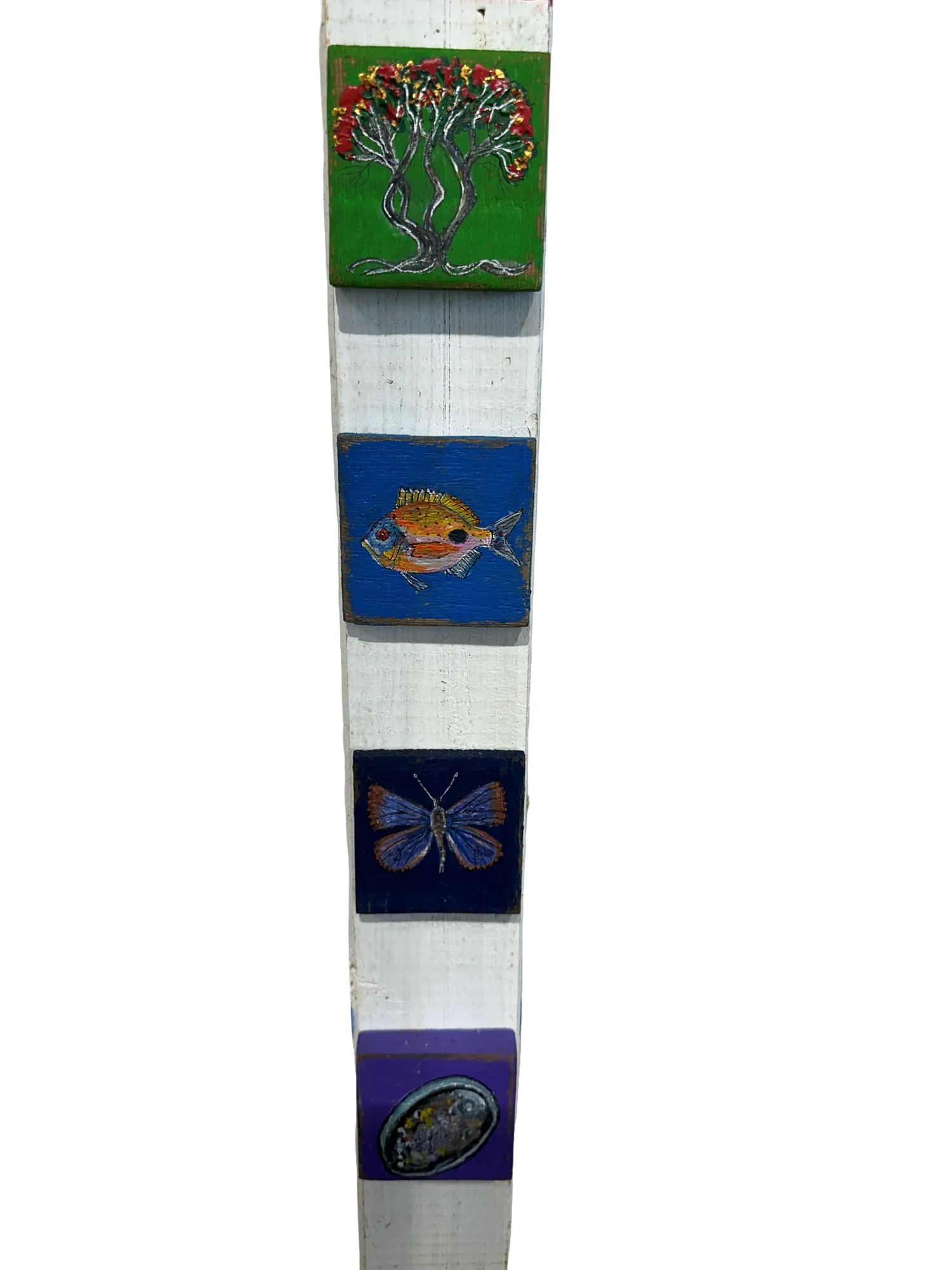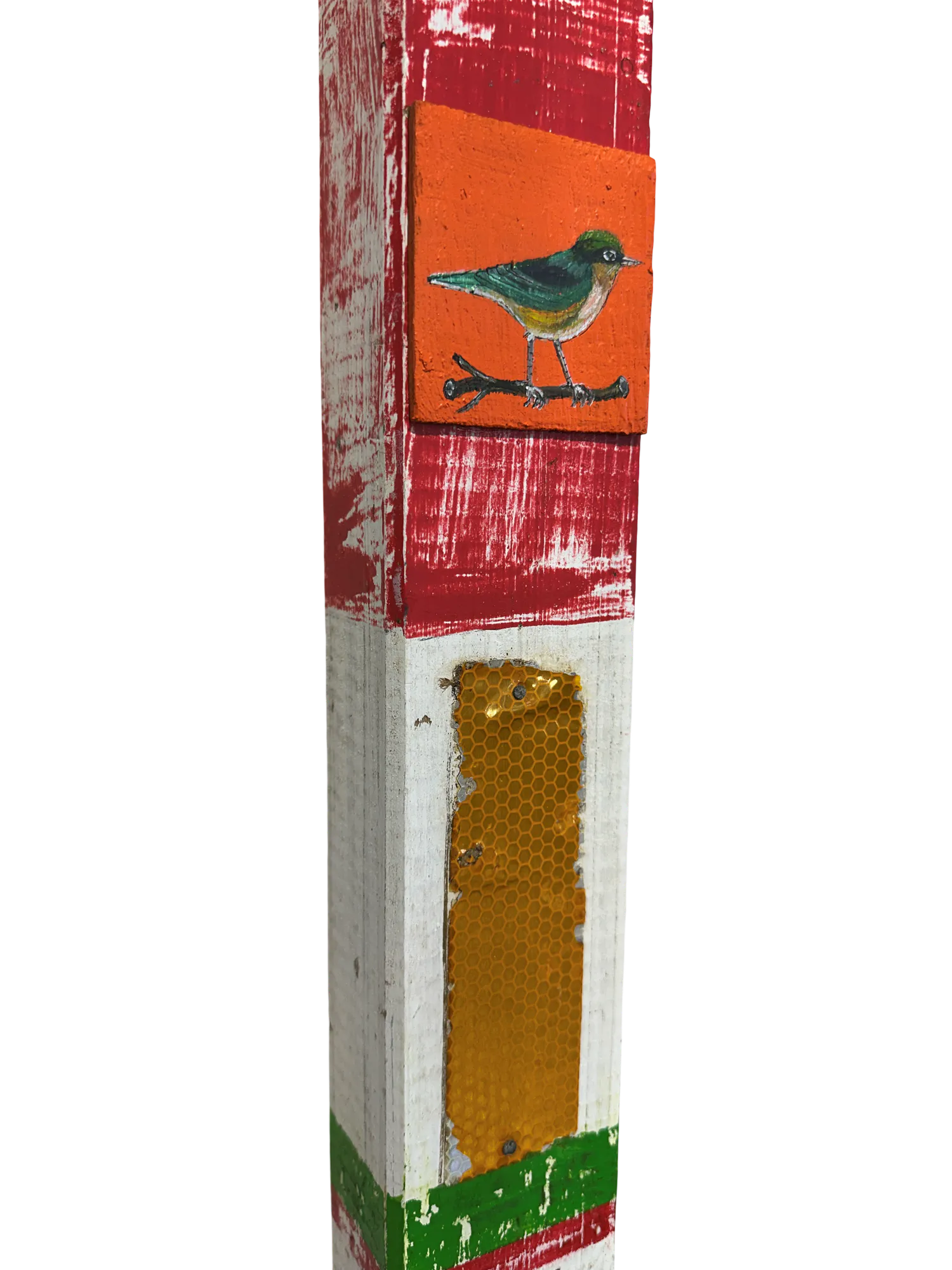 An original upcycled wooden road marker artwork by Chrissie Burnside