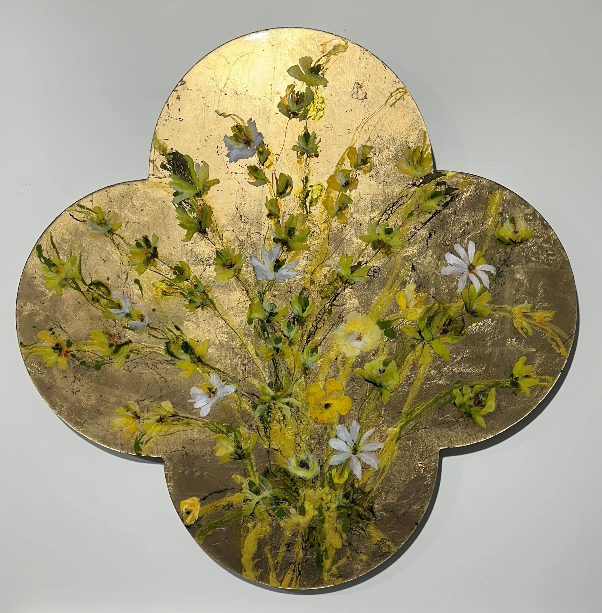 An original wall art quatrefoil with gold leaf and flowers and layers of resin.