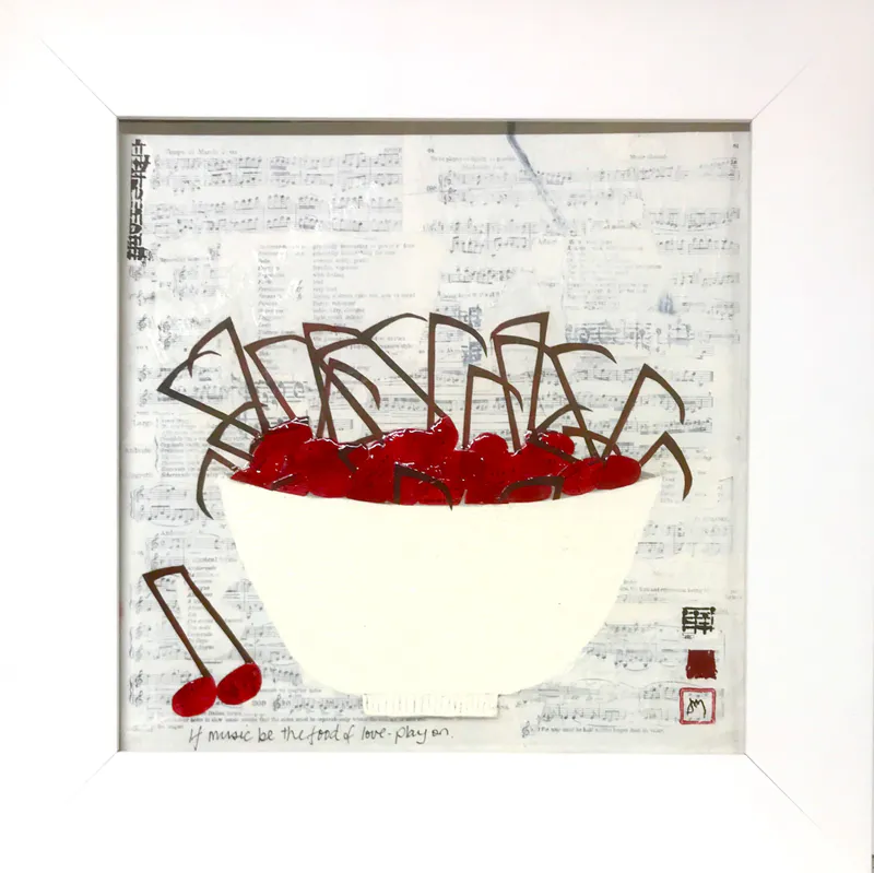 Created with the sense of sound as a theme, this gorgeous composition has music in the background with the bowl of cherries front and centre made to look like music notes.