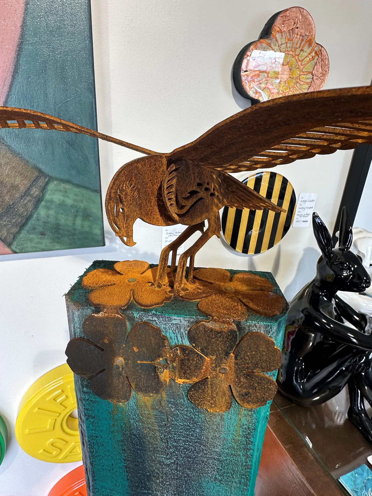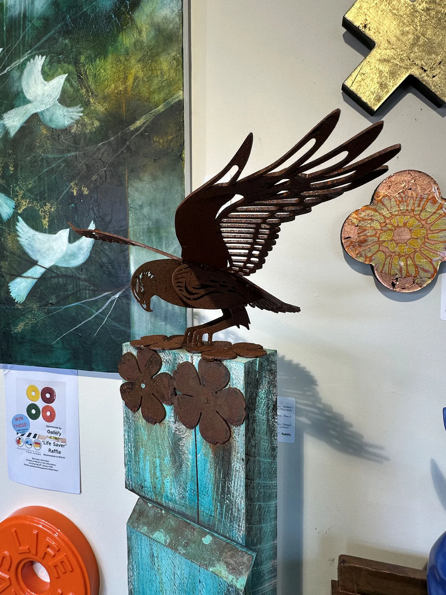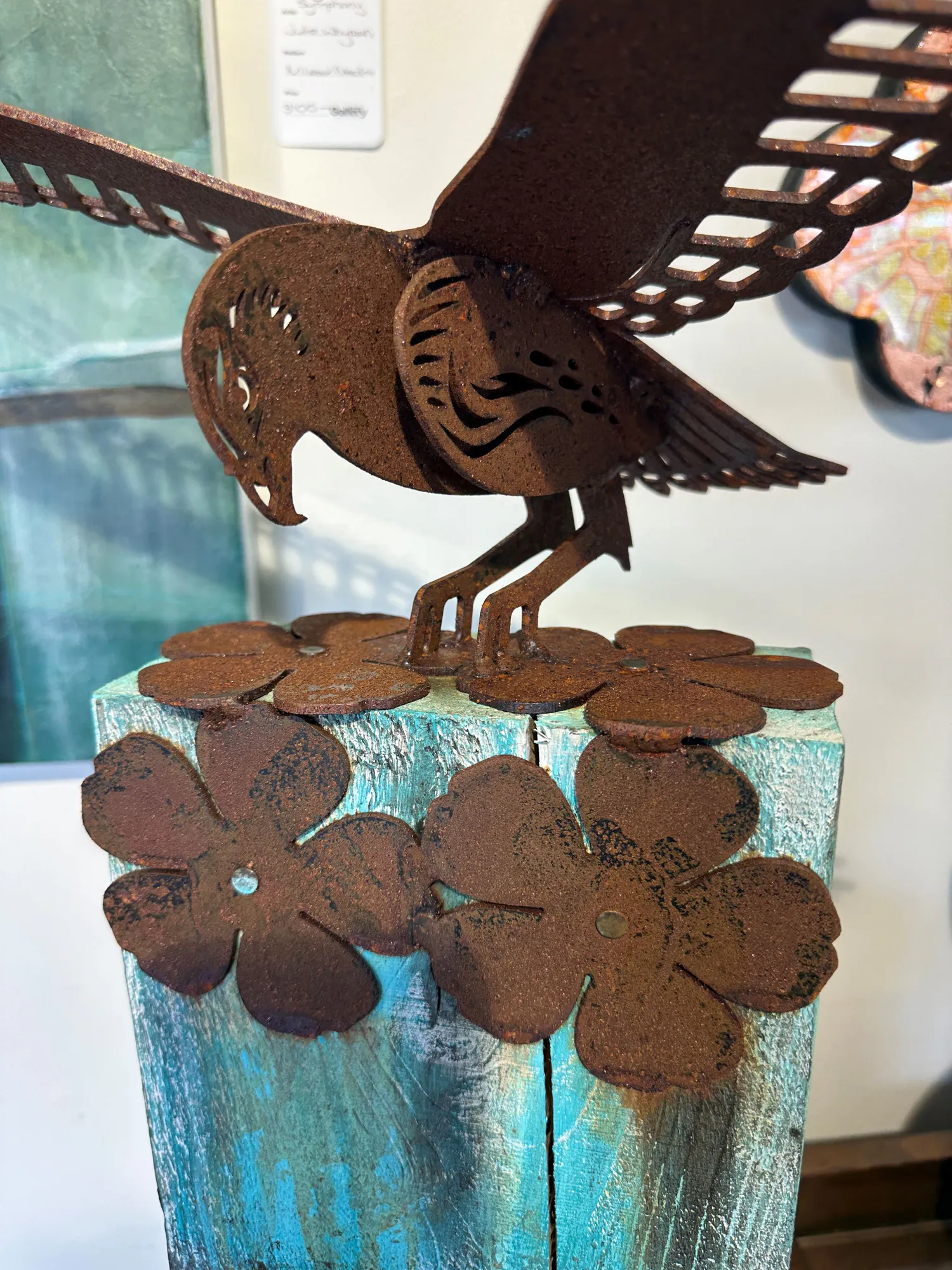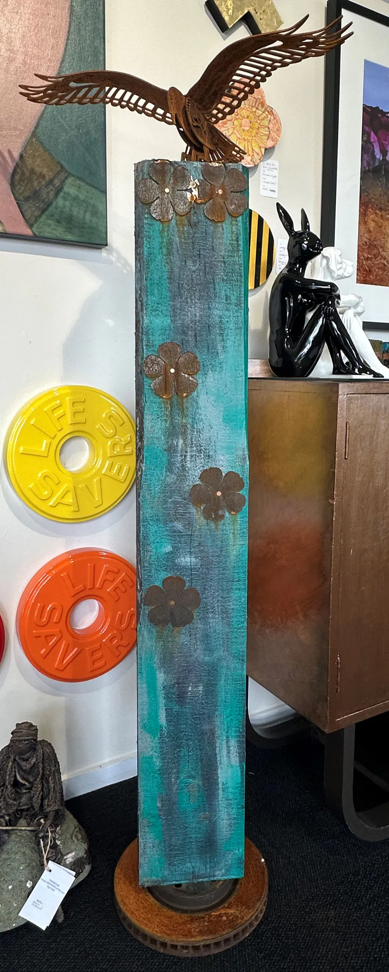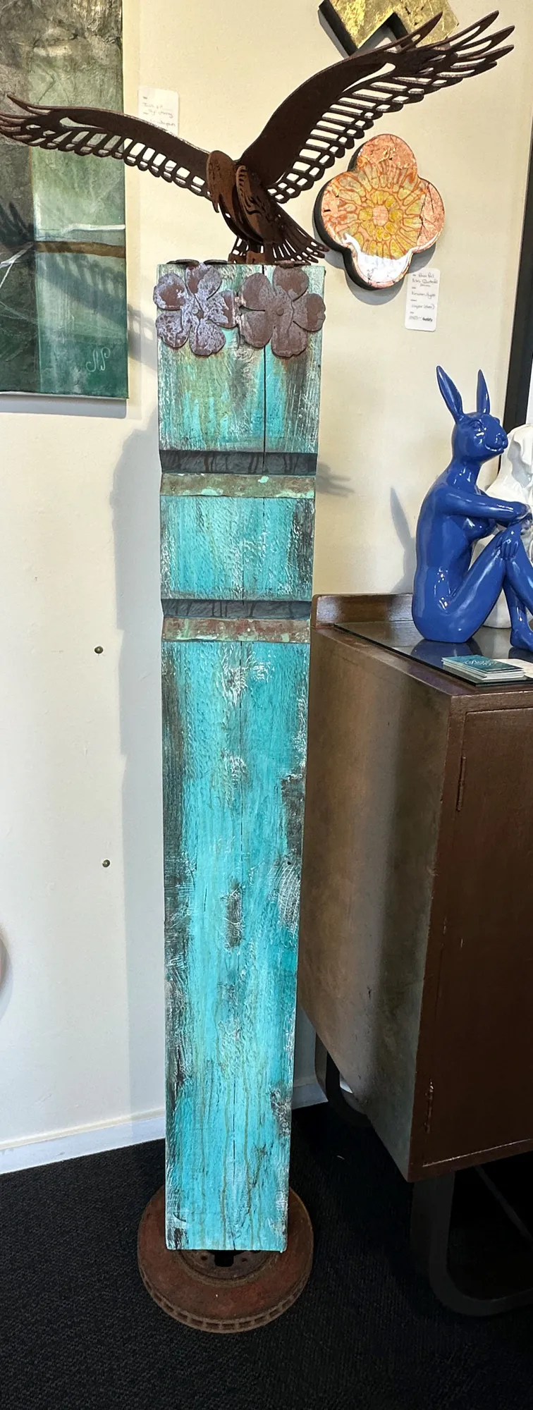 An original Corten Steel Kahu on recycled timber Totem by Rustic Soul Sculptures