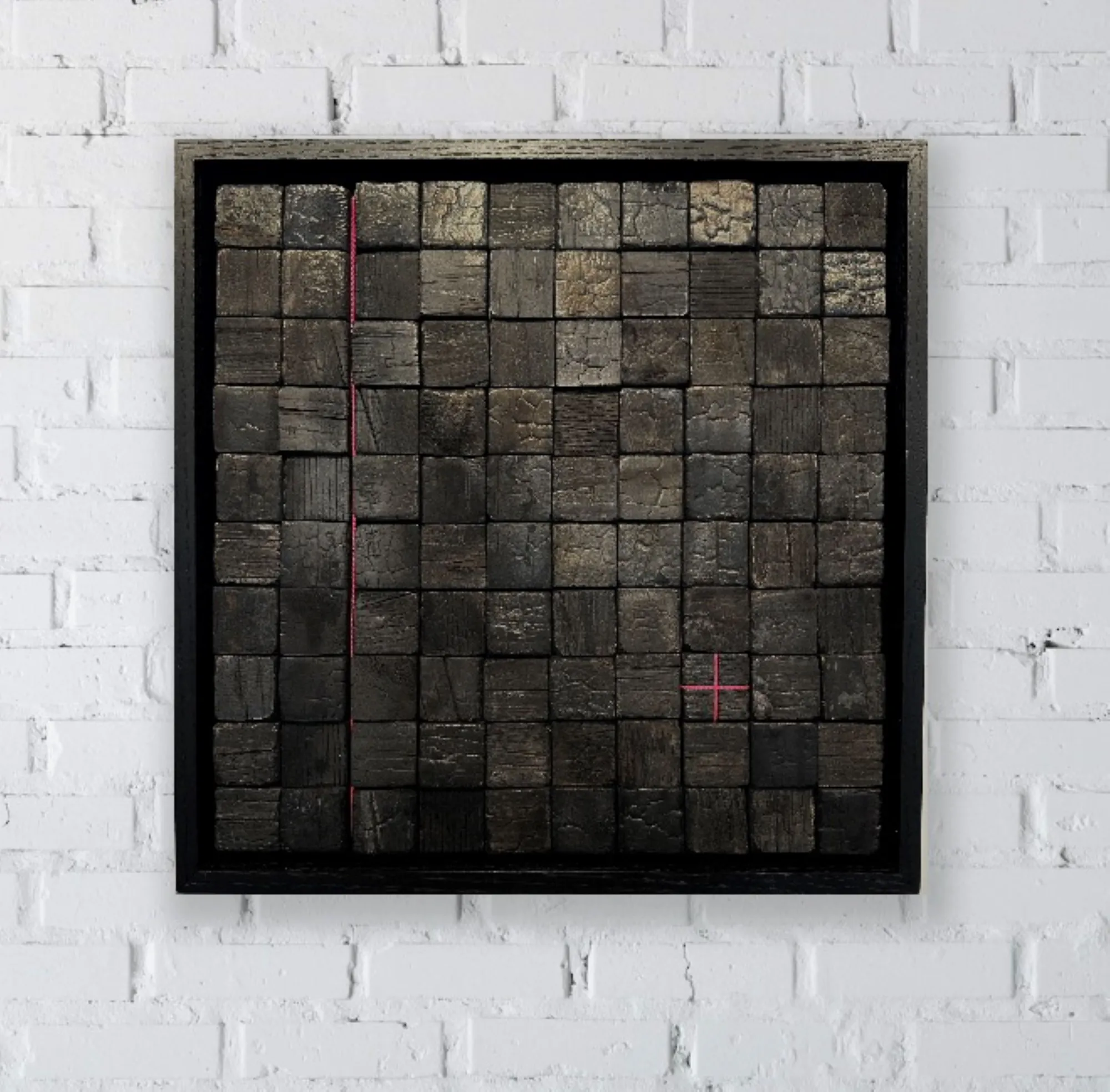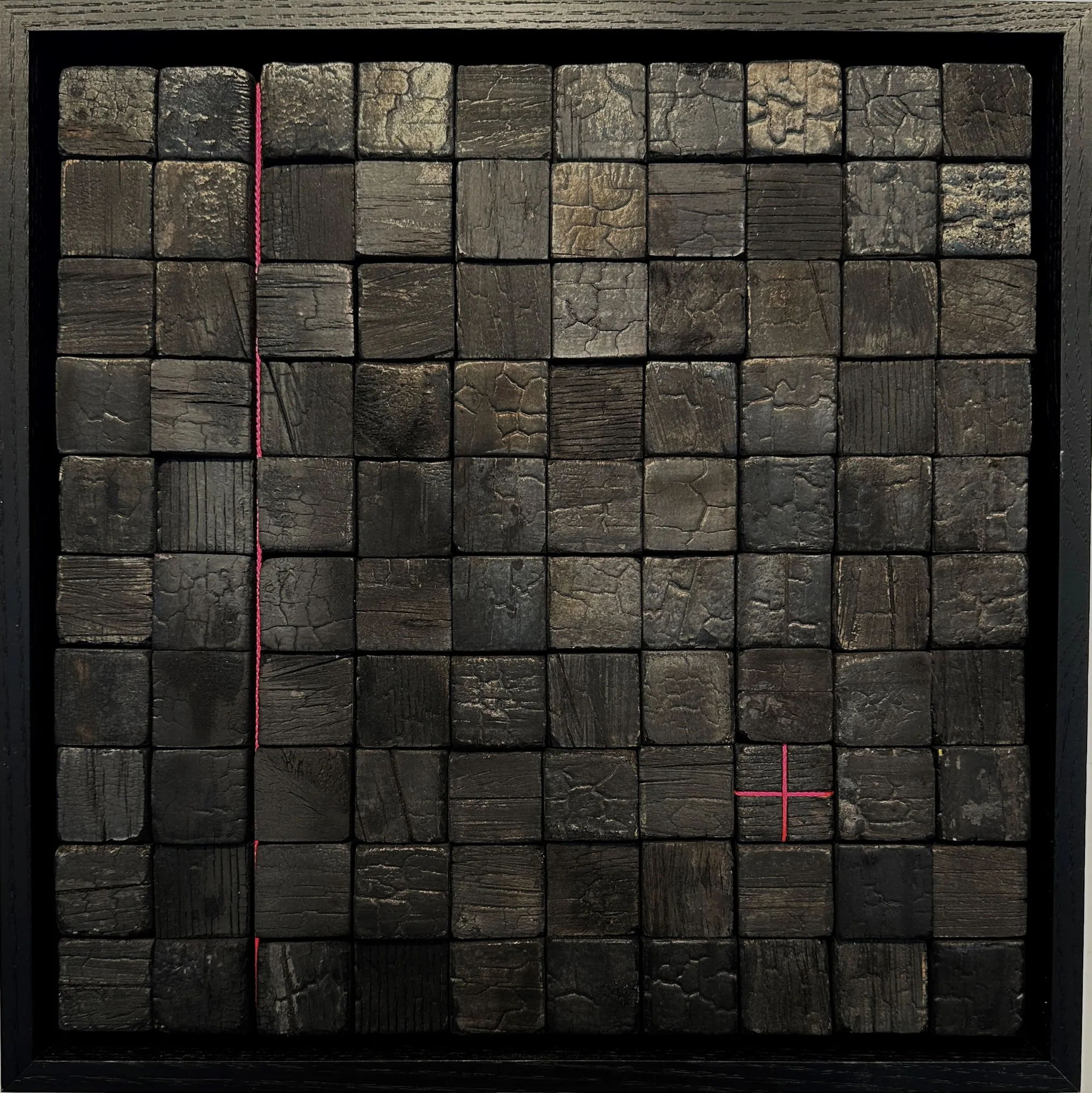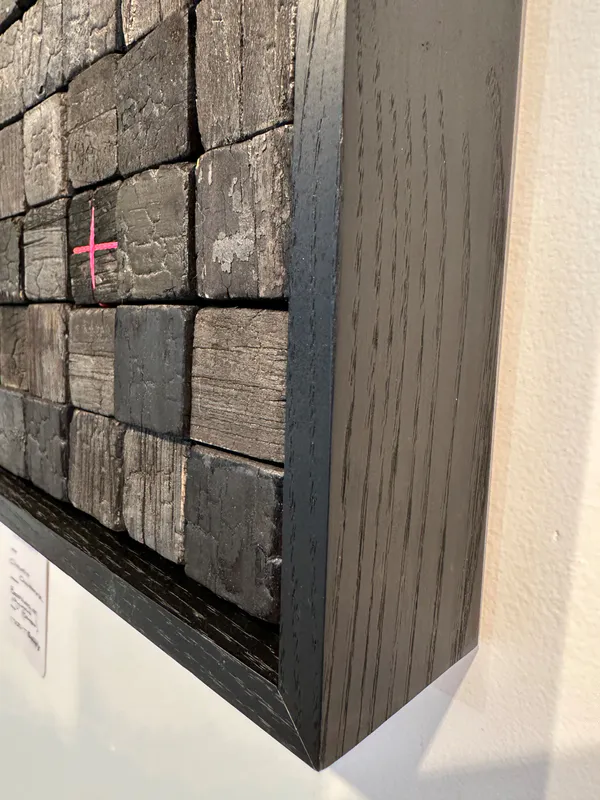 An original sculptured artwork using charred beehives on plywood in custom black frame with pink thread as detail.