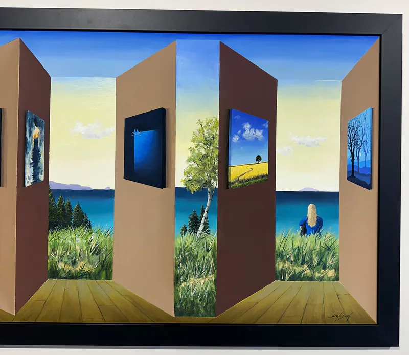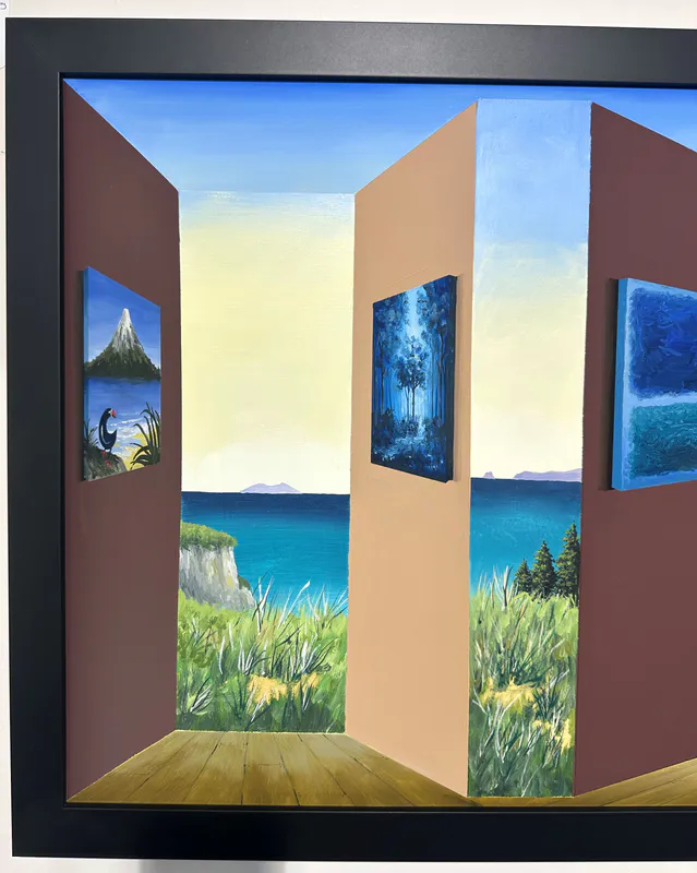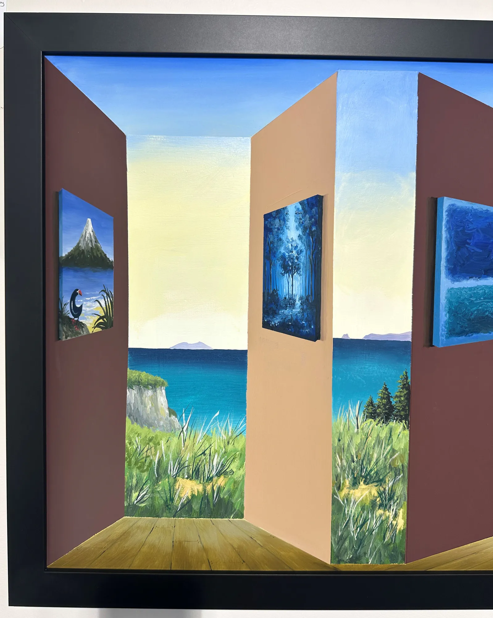 An original 3D reverse perspective oil painting by Omokoroa based artist John Wilson.