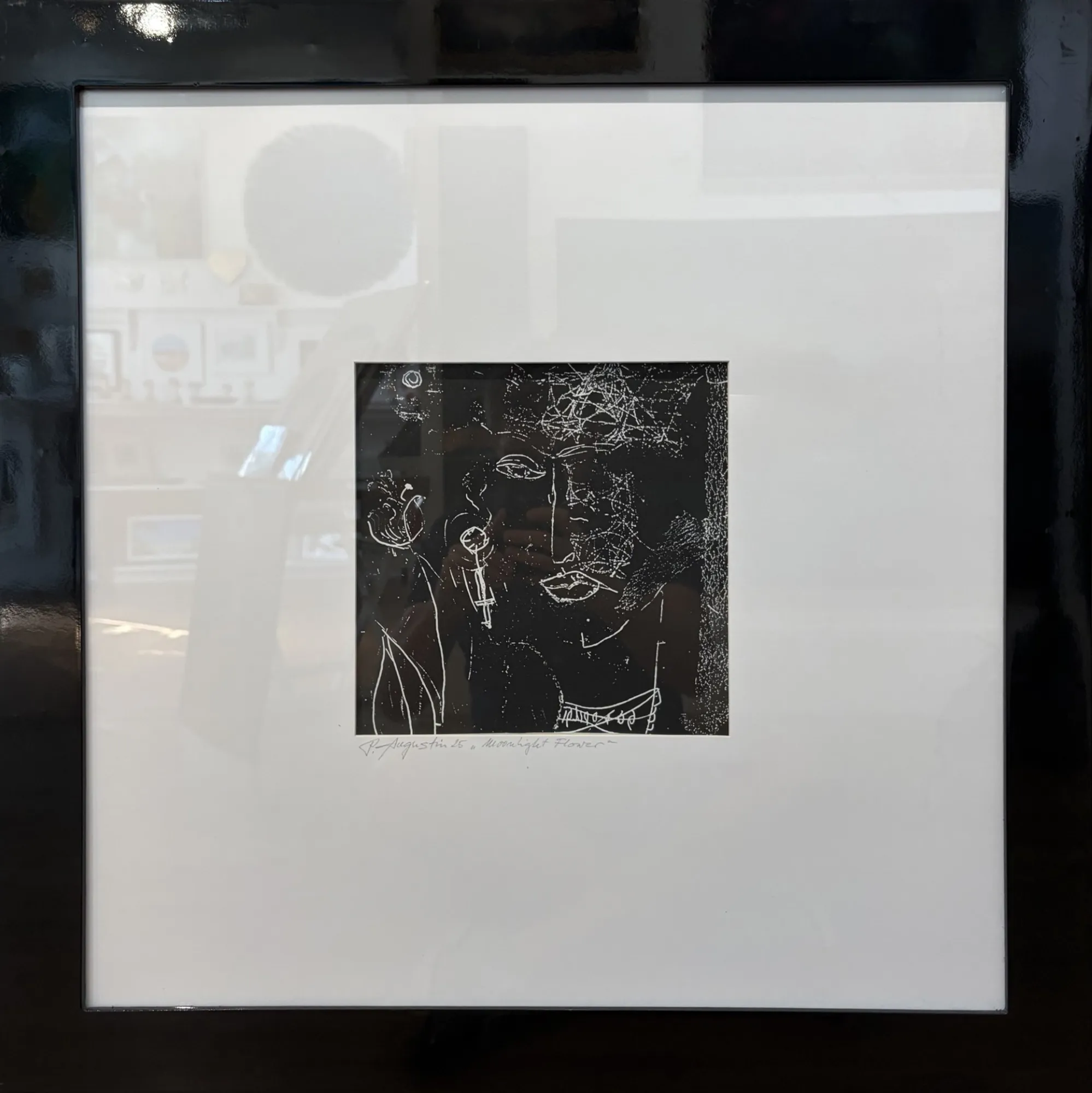 An original Monoprint on paper, framed with a large white matt and beautiful black lacquered frame.