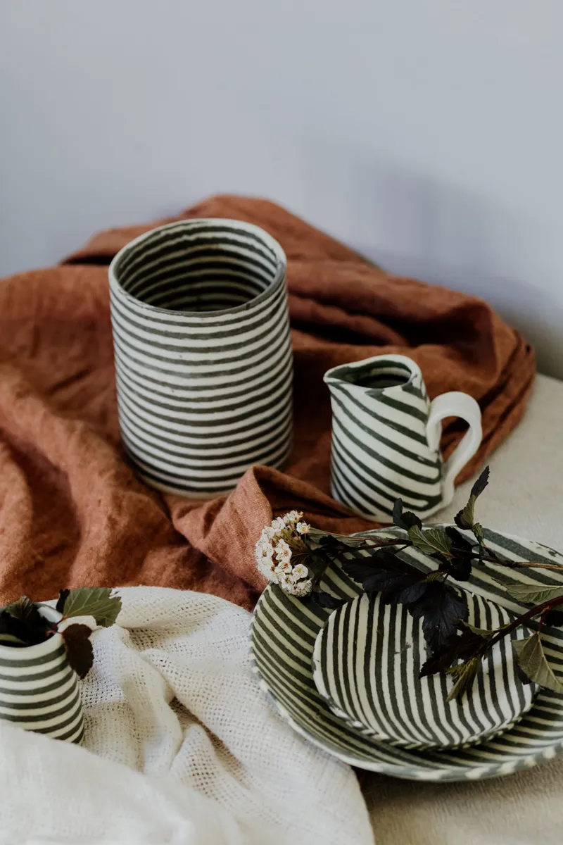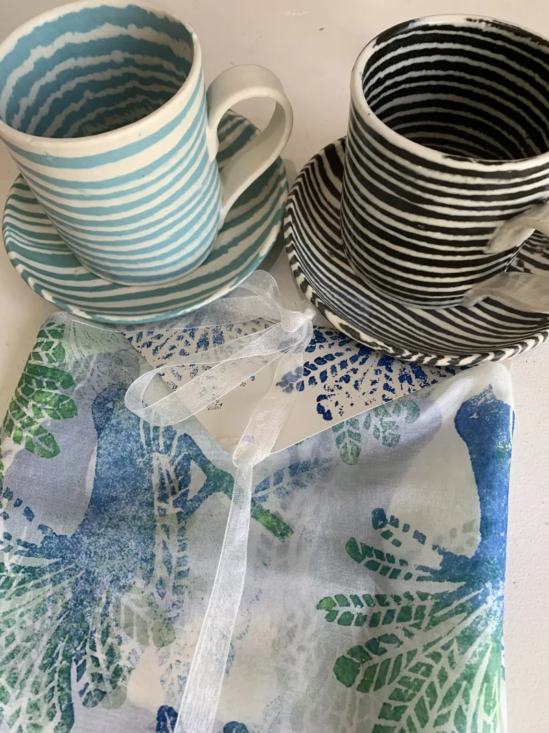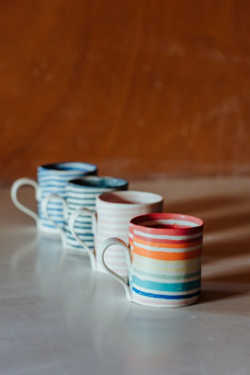 Nerikomi is the Japanese art of folding clay. Alex from Mystery Creek Ceramics has created a colorful and fun selection of ceramics that are very reasonably priced and make great gifts.