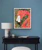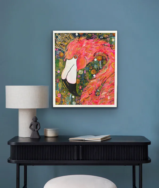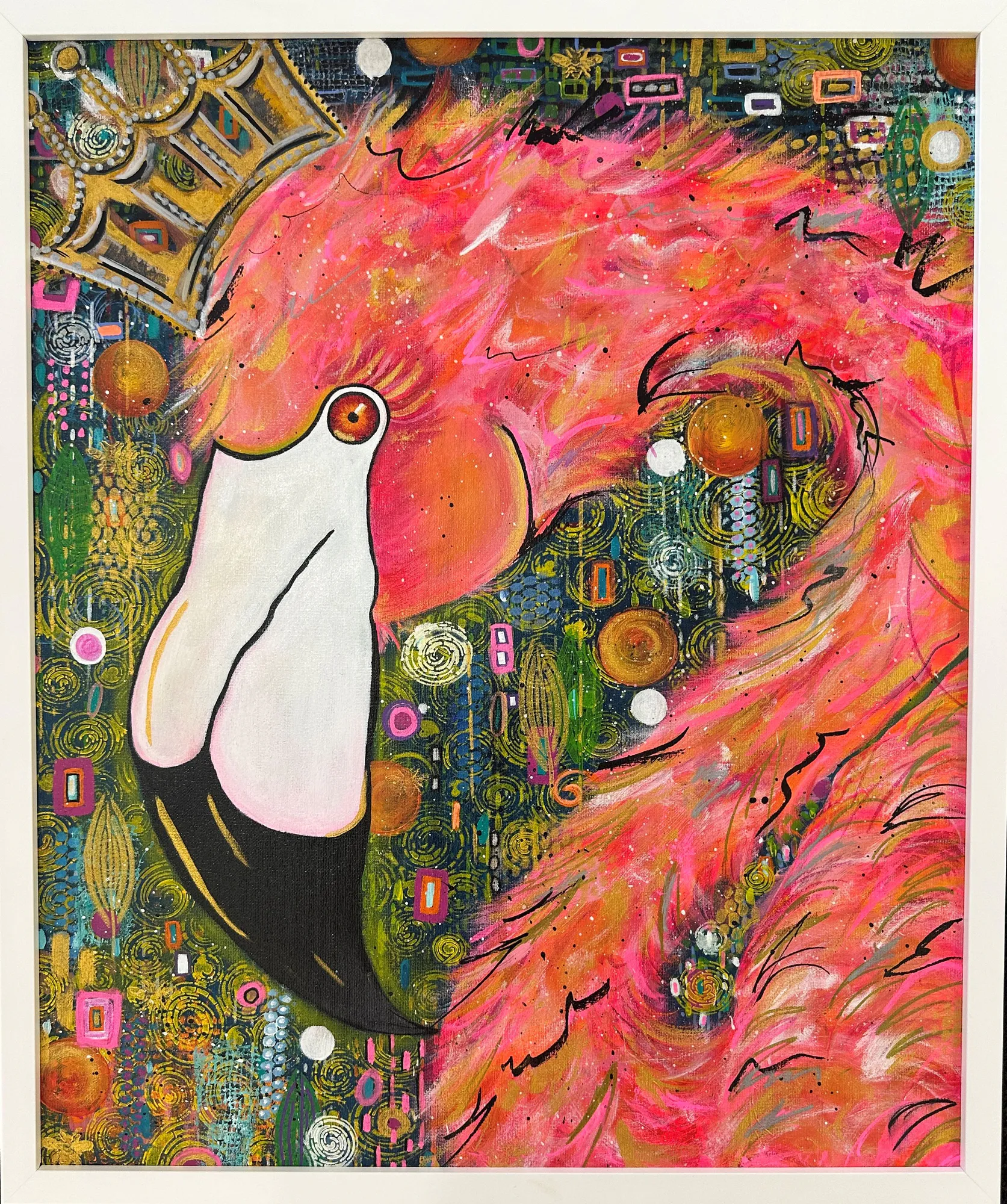 An original painting on canvas framed in a white wooden frame (no glass). Flamingo's crown has a coating of resin on it.