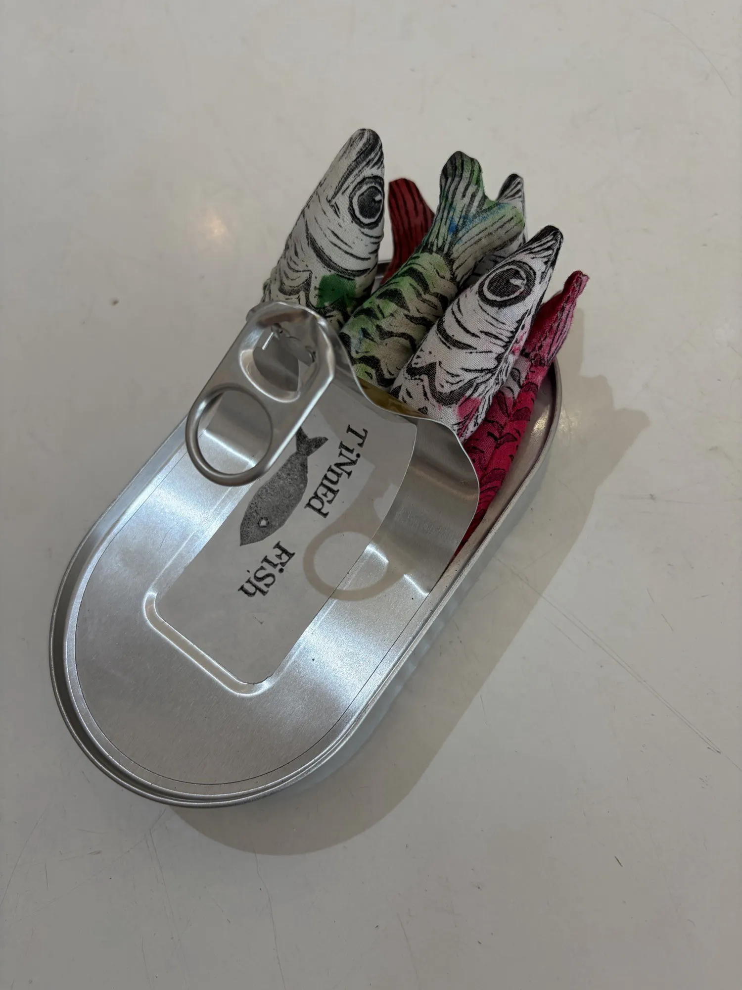 An original Mixed Media artwork with hand-printed fabric fish in a sardines tin by Sue Preston