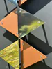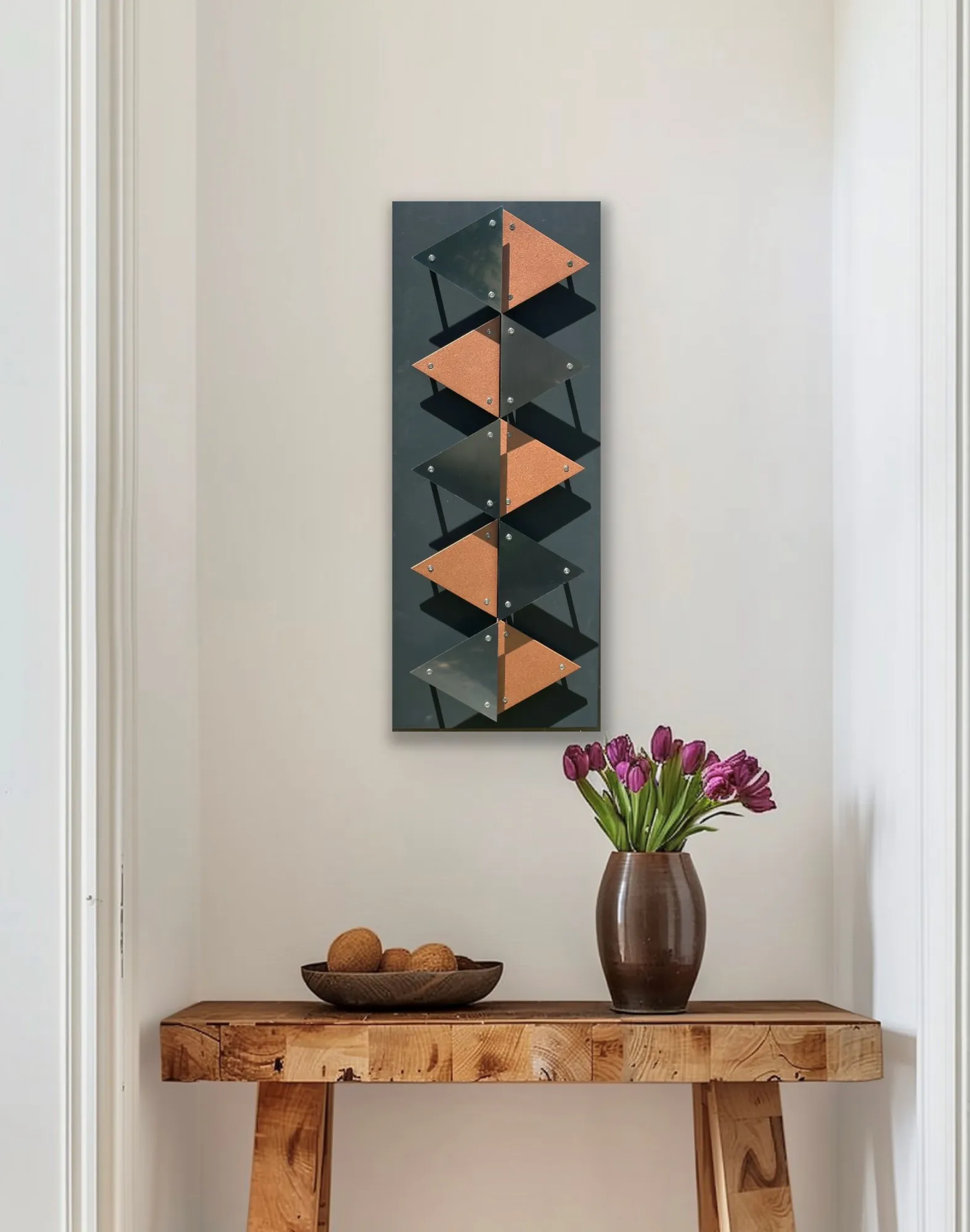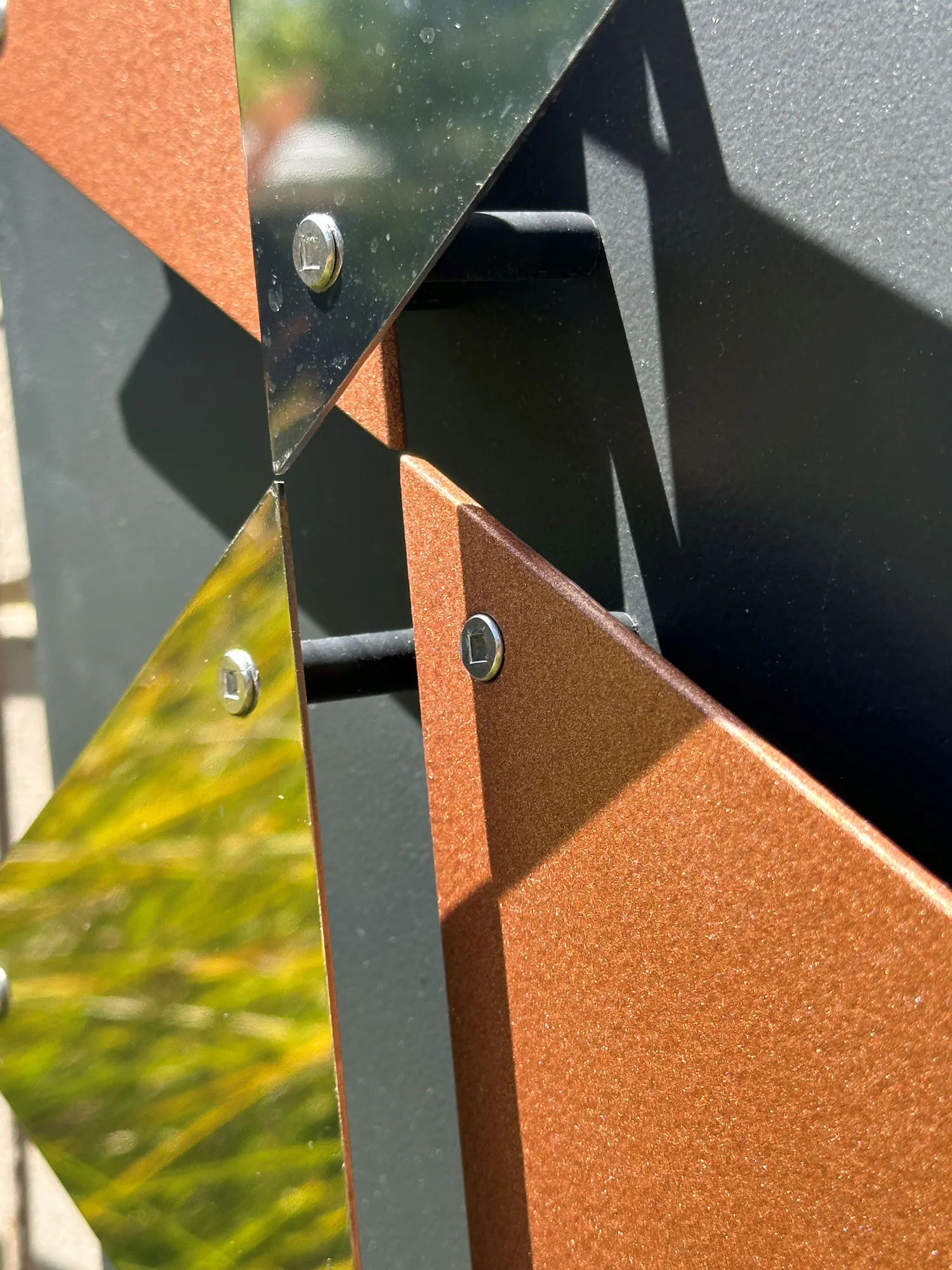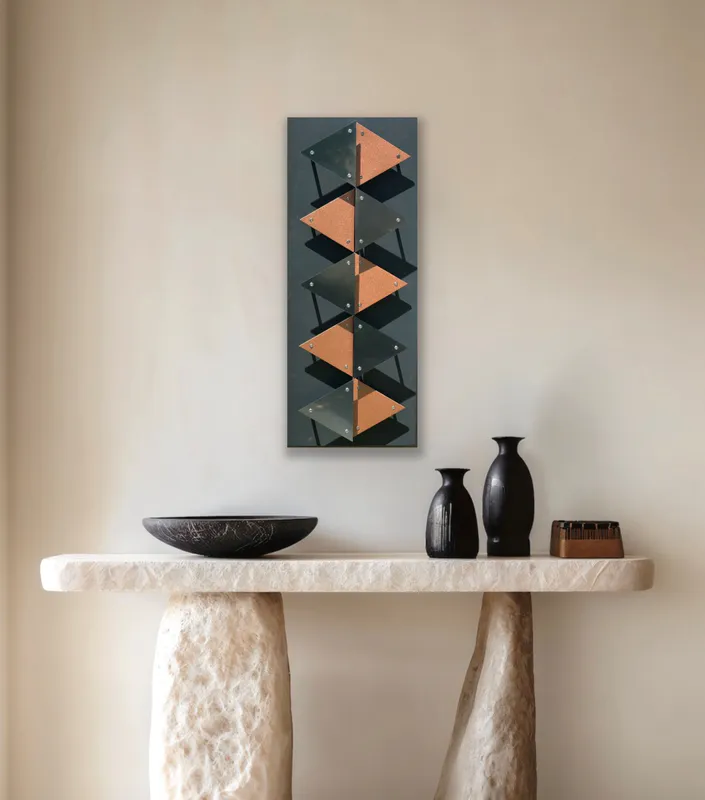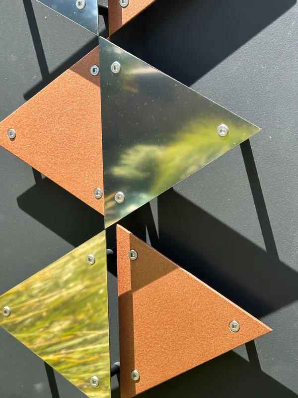 Created with stainless steel, painted and sealed acrylic, graphite tubes to protrude the stainless and acrylic triangles, stainless steel screws. Backing board is Sign X which is fully water resistant and used by signwriters for external signs.